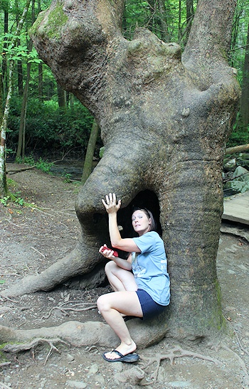 The first part of the trail was flat and featured a stroll along Ash Hopper Branch. We got to a small foot bridge that crossed the creek next to a tree that had some very interesting features (photo below). The base of the large tree was hollowed out so large that a kid could easily get inside.
