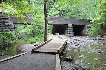 After crossing Ash Hopper Branch, the trail switched the other direction briefly and soon the small creek merged with the larger Fighting Creek. The trail followed the creek underneath a road bridge and then we went up a flight of stairs. I noticed that there is a drop-off point on this road for those seeking to make the hike even shorter (at this point we were about a tenth of a mile from the falls).