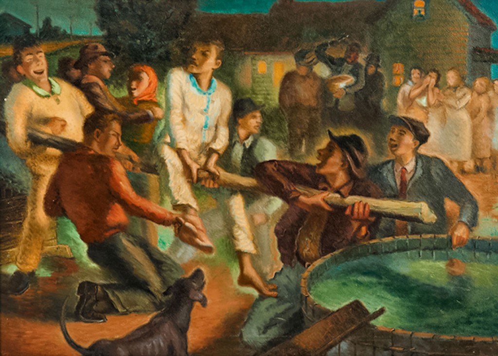 Then they would rush into the house, grab the groom, and place him on a wooden rail, riding him around the yard. The bride was often plunged into a tub of cold water and carried around behind him.