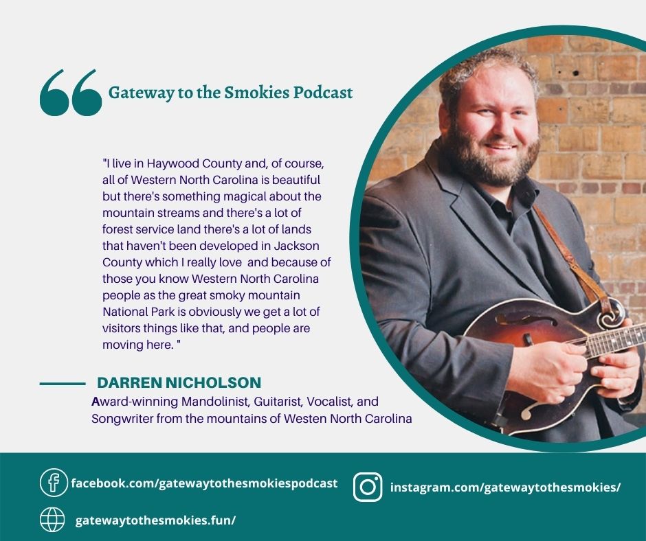 Tonight’s episode of Gateway to the Smokies starts off with host Joseph McElroy listing off a few notable upcoming events for the audience and for the local area to keep an eye out for. Next, comes the introduction of today’s guest, Darren Nicholson. Darren talks about who he is, what he has accomplished as a singer, songwriter, and instrumentalist, and the journey to becoming who he is today.