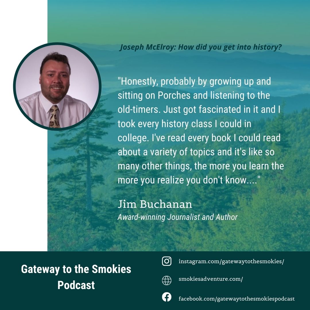 00:05:02.790 –> 00:05:19.020 Joseph McElroy: COM, the smoky or events listings our guest today is Jim Buchanan ,Jim is a native of Jackson county and an award-winning journalist and author now living in Clyde North Carolina.