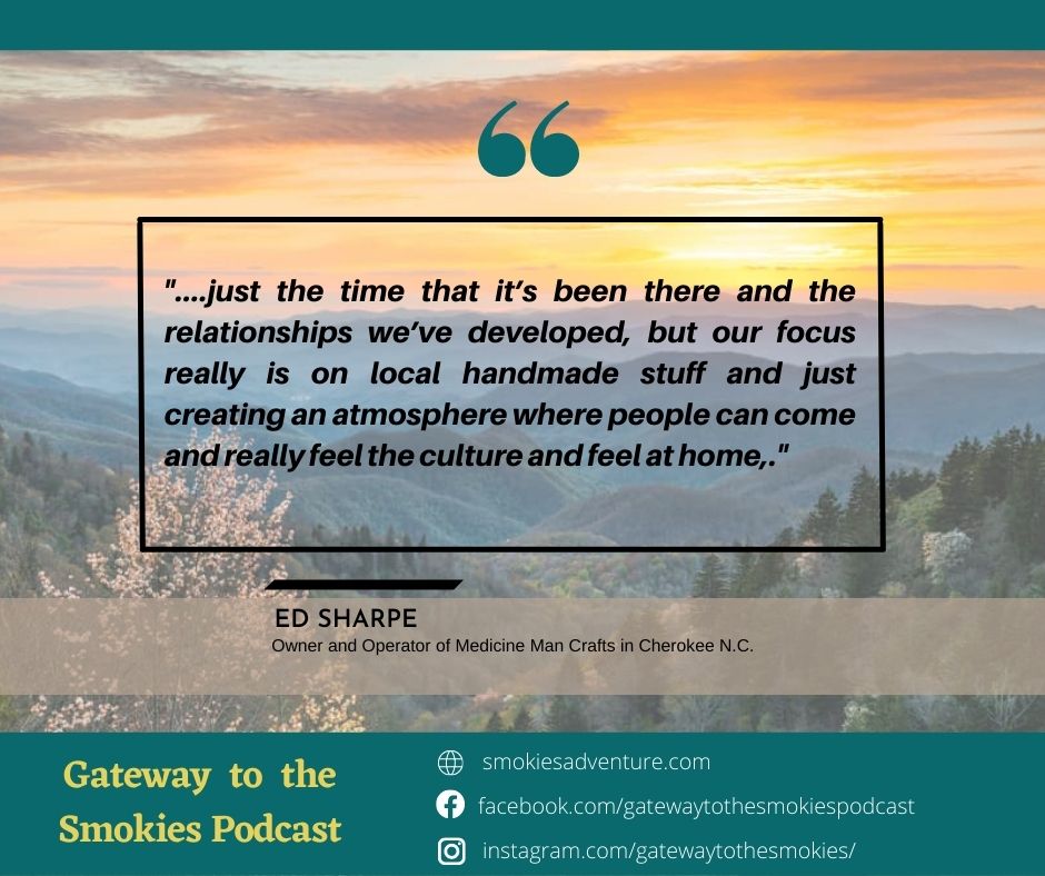 We’re joined by Ed Sharpe, Owner, and Operator of Medicine Man Crafts in Cherokee N.C.The business, founded by Tom Underwood in 1963, and later sold to Kay Sharpe—Ed’s late mother – is one of the oldest and most prestigious purveyors of authentic Cherokee crafts on the Qualla Boundary. Ed is also an avid hiker and nature photographer –is proud to carry on the great legacy of true Cherokee culture created by Tom Underwood and Kay Sharpe.