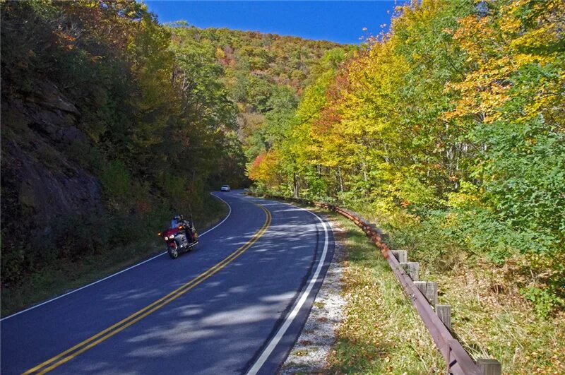 As its name suggests, the Cherohala Skyway takes riders to high elevations with spectacular mountain views. For 18 miles in western North Carolina, the Skyway winds its way through the Cherokee National Forest, increasing in altitude to over 5,400 feet. Then, it twists and turns for 23 miles down into the mountainous backcountry of eastern Tennessee’s Nantahala National Forest. The Skyway is a wide open road with very little congestion and delivers unobstructed and awe-inspiring views at multiple scenic overlooks along the way.