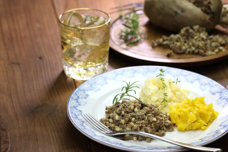 In addition to the main course of haggis, neeps, and tatties, a Burns’ night menu typically includes an old Scottish recipe of cock-a-leekie soup, meat pies, and cranachan, a traditional Scottish dessert made with oatmeal, raspberries, whisky, honey, and cream.
