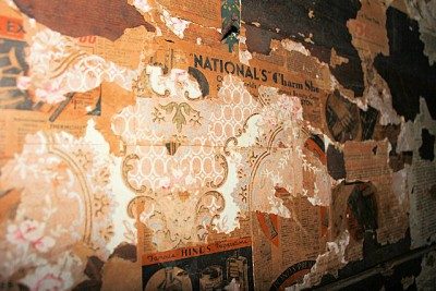 Old newspapers used as backing for wallpaper inside the Caldwell house in Cataloochee.