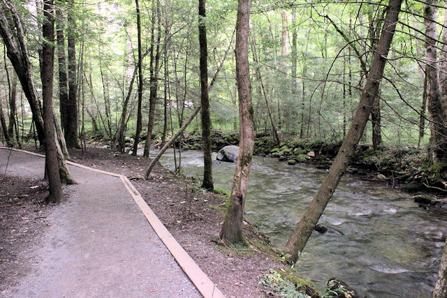 After crossing Ash Hopper Branch, the trail switched the other direction briefly and soon the small creek merged with the larger Fighting Creek. The trail followed the creek underneath a road bridge and then we went up a flight of stairs. I noticed that there is a drop-off point on this road for those seeking to make the hike even shorter (at this point we were about a tenth of a mile from the falls).