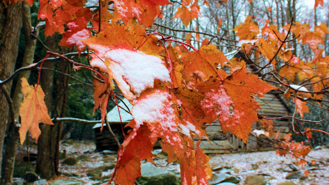 An early snowfall on some leaves in the Smokies. Photo by Shane Dunnaway.